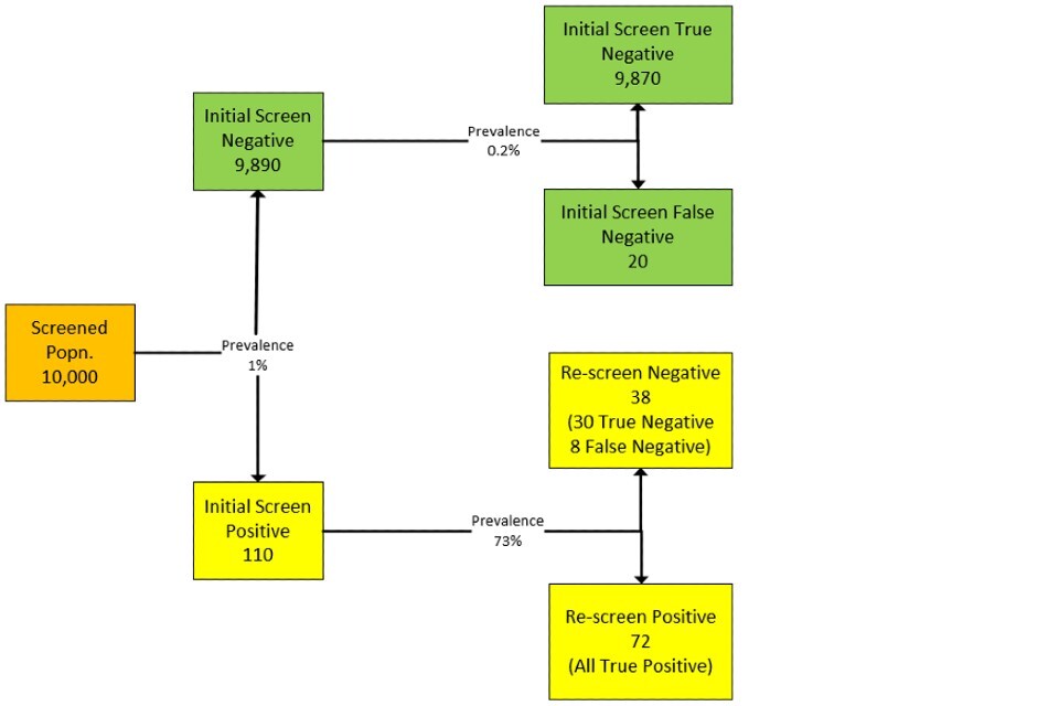 | Population prevalence | Initial test negatives | Initial false negatives | Initial test positives | Re-test negatives | Re-test true negatives | Re-test false negatives | Re-test odds ratio for infection present given a negative re-screen test result | Re-test Positives (≈ true positive) |