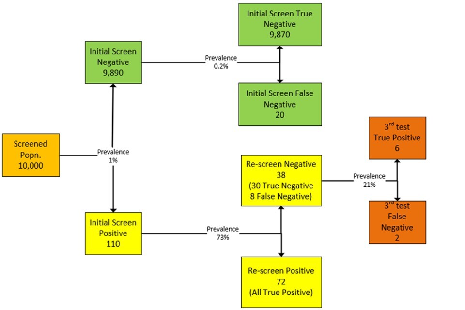 Working this through as an illustrative flow diagram for a prevalence of 1% we get the following outcomes from 10,000 tests: