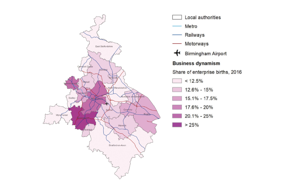 Map of the West Midlands showing the share of enterprise births in 2016.