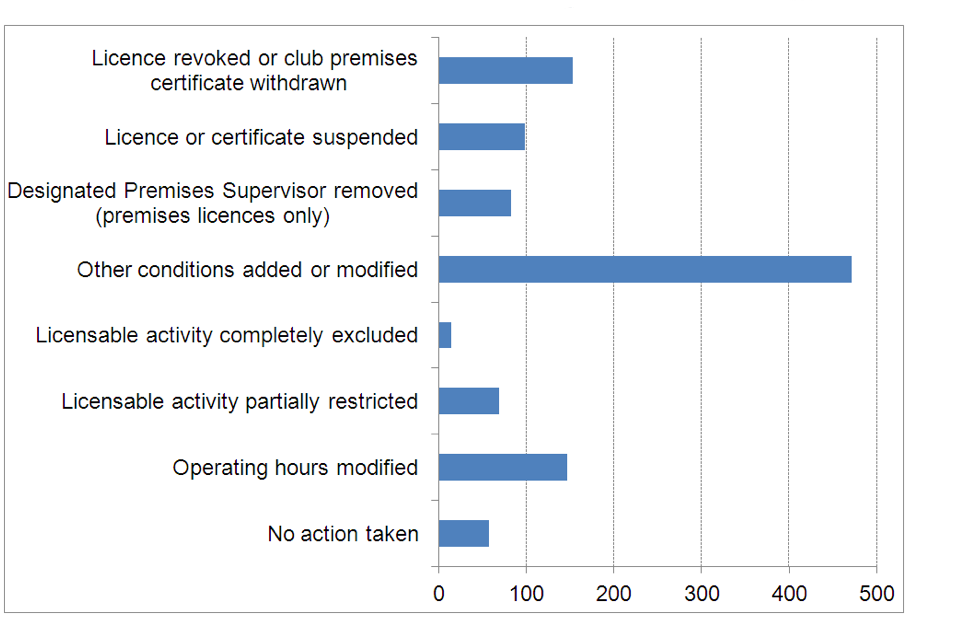 Regarding the action (or actions) taken following reviews, the majority (471) resulted in conditions being added to the licence or modified, 150 resulted in a licence being revoked or a club premises certificate being withdrawn and 98 resulted in a licence or certificate being suspended. No action was taken following 58 reviews.
