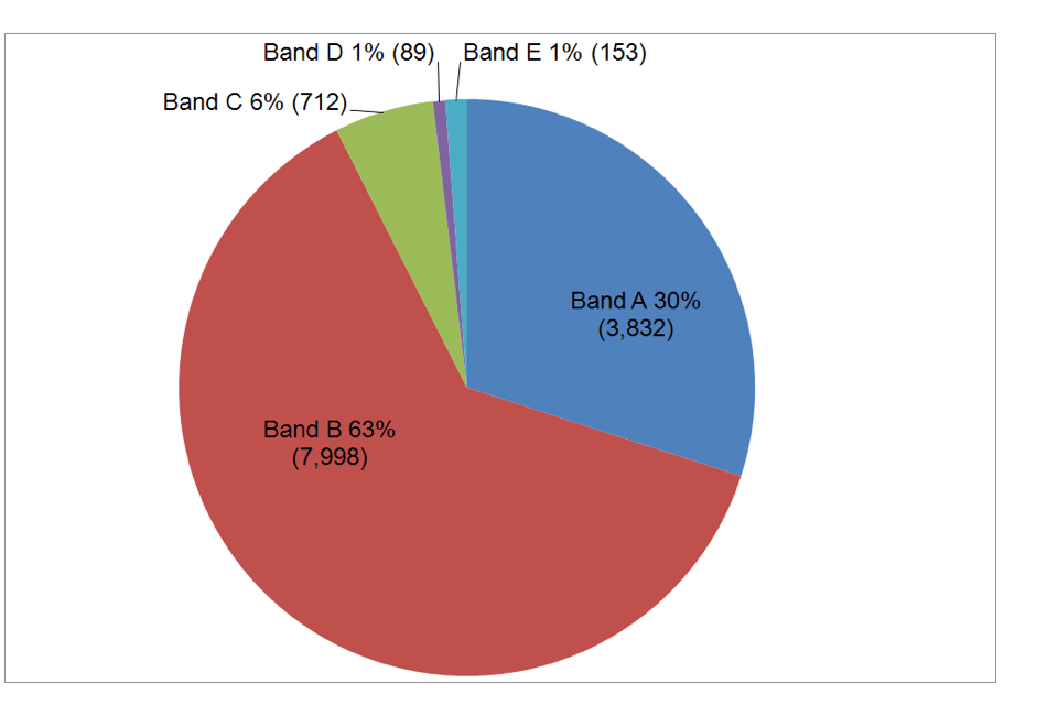 Based only on the LAs who provided data, there were 15,479 club premises certificates in force on 31 March 2013, and of these, fee band information was provided for 12,784. Nearly two-thirds (63% or 7,998) were in Band B. The next largest fee band was Band A, which accounted for almost a third (30% or 3,832) of premises.