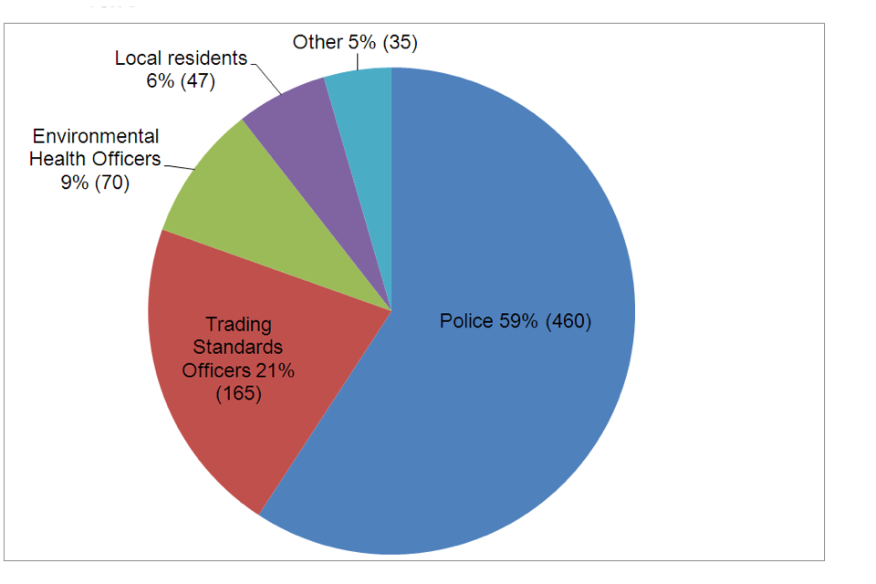 The police were the main responsible authority, instigating 59% (460) of the total number of reviews, with trading standards being the second most common responsible authority, instigating 21% (165). Environmental health officers and local residents instigated 9% (70) and 6% (47) respectively.