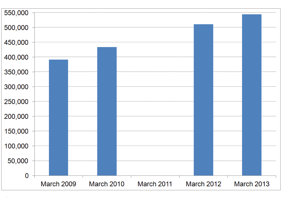 Based on data received from LAs and estimates for the non-respondents, there were 544,600 personal licences in force in England and Wales on 31 March 2013, 7% (34,300) more than the previous year, and 39% (153,000) more than 31 March 2009.