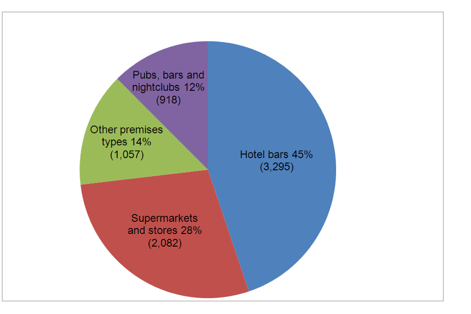 On 31 March 2013, 45% (3,295) of all 24-hour alcohol licences were in hotel bars, of which, for where it was known, 85% (2,660) were open 24 hours for guests only and the remaining 15% (481) were open to the public as well as guests.