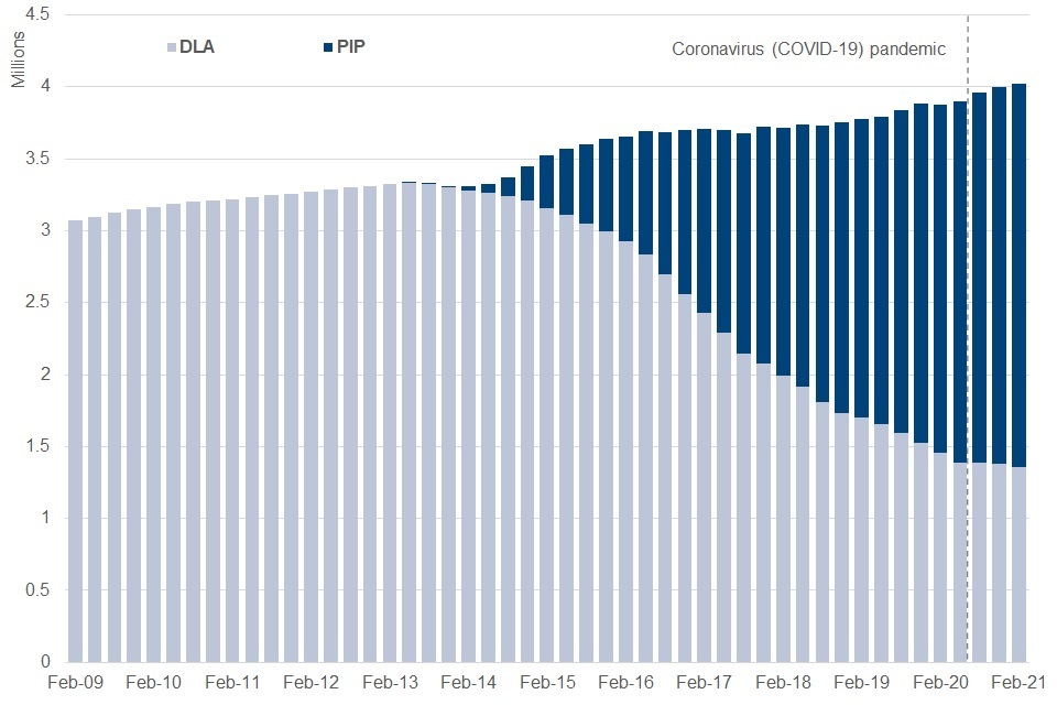 There were 4 million people claiming either PIP or DLA at February 2021, an increase of 150,000 during the last year.