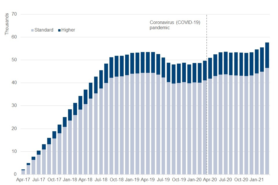 Latest JSA figures to February 2021 show that there were 260,000 people claiming Jobseeker’s Allowance (JSA), which is still an increase of 96,000 (57%) on the pre-pandemic figure of 170,000 at February 2020.