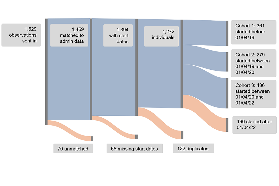 This analysis focuses on 1,076 individuals who participated in WWTW programmes between 1 April 2014 and 1 April 2021. This is a subset of the 1,529 observations worth of data originally shared with DWP, Figure 1 shows the numbers and reasons for the exclusions. Primarily data was restricted to those who started on a programme before 1 April 2022 to ensure that one full year of employment follow-up data was available at the time of carrying out the analysis. The 1,076 individuals evaluated represents 37% of the 2,880 total referrals to WWTW since 2014.