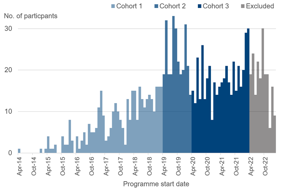 Figure 2: showing the distribution of start dates for WWTW programme participants. The three different cohorts and those who were excluded from the analysis due to a lack of available follow-up data are highlighted