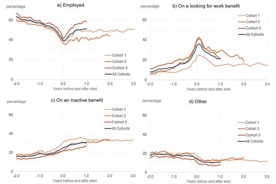Figures 4 b) and c) show that the earliest cohort had lower rates of people on Looking for Work benefits and higher rates of people on inactive benefits, particularly when compared to cohort 3. The spread in the lines of Figure 4 a) shows the different employment trajectories for each of the three cohorts. Cohorts 1 and 3 have steeper rises after programme start, indicating a speedier take-up of employment than cohort 2, where the rise is more gradual. Many factors may be influencing this including the COVID-19 pandemic which may have affected availability of employment opportunities.