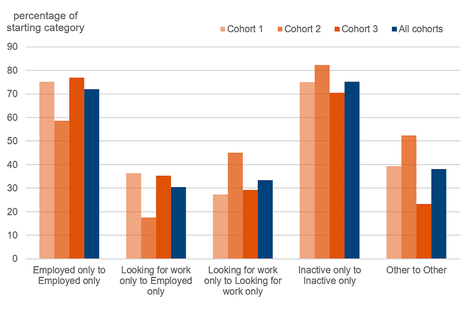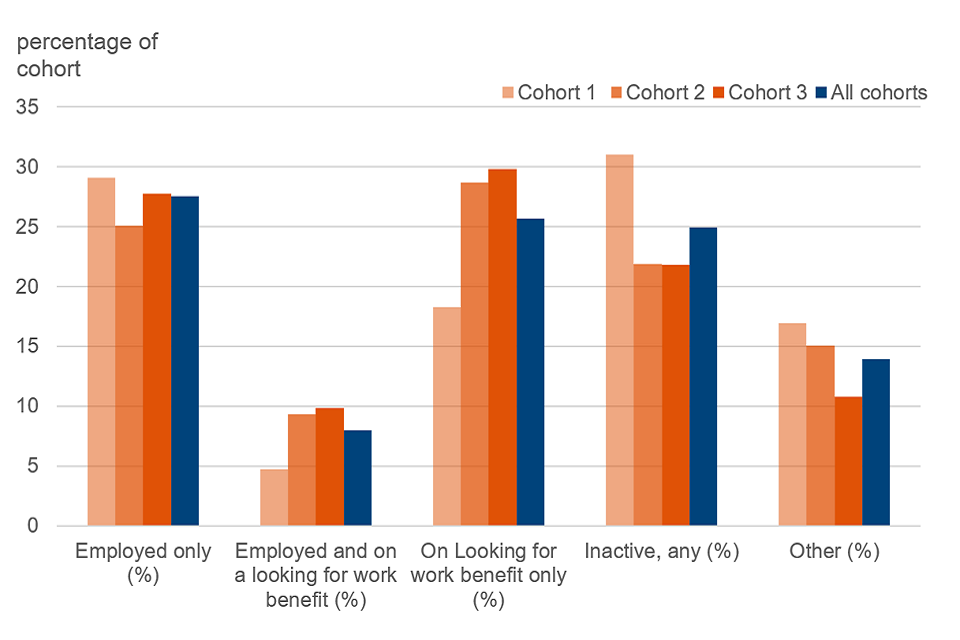 Table 3 and Figure 6 show the breakdown of the main labour market category combinations at programme start, again highlighting disparities between the cohorts, with the first cohort having a lower percentage in the Looking for work category (whether also employed or not) and higher percentages on an inactivity benefit than that the other cohorts.