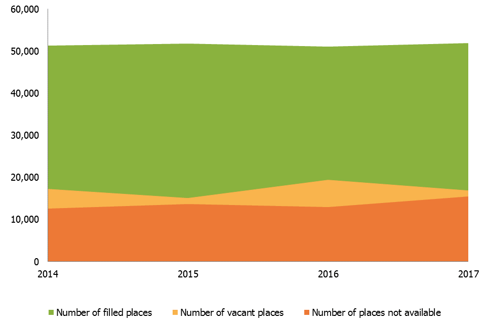 The number and proportion of places ‘not available’ increased from 13,000 (16%) in 2016 to 15,520 (18%) in 2017.