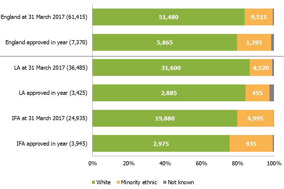 As at 31 March 2017, 24% of fostered children were from minority ethnic groups, compared with 14% of all foster carers.