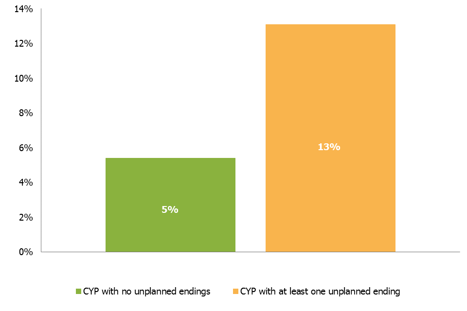 Thirteen percent of children who experienced at least one unplanned ending had persistent school absence in comparison with 5% of children with no unplanned endings. The rate of persistent school absence increased to 19% for children who experienced at least one unplanned ending and at least one educational placement change.