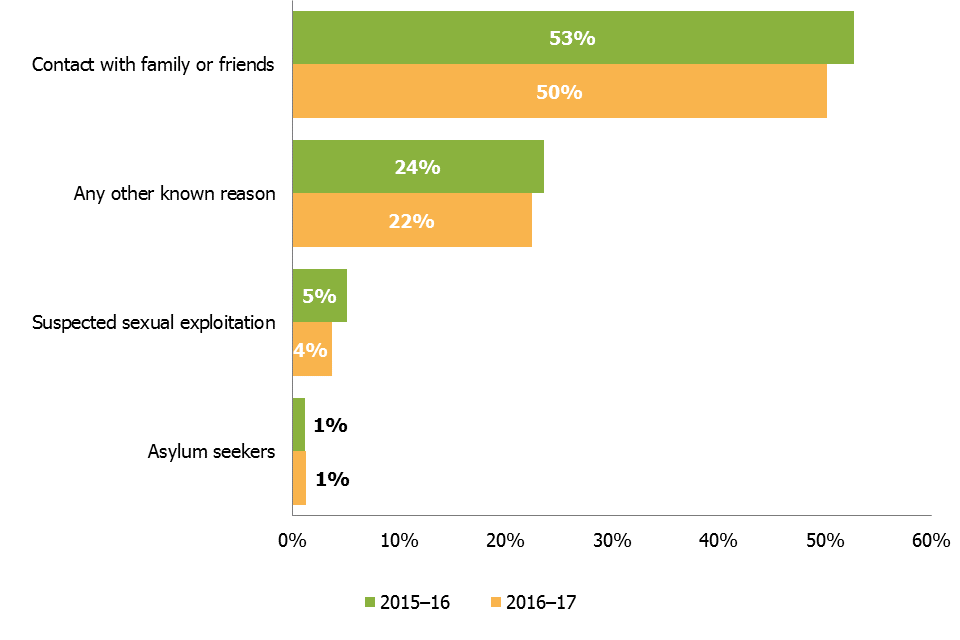 This was slightly lower than the 10% for children in care reported by the DfE; however, their figure is likely to be impacted by including all types of placements. DfE data on children missing from foster placements is ‘not available’. The DfE also reported a higher average number of incidents per missing child (5.7). ‘Children looked after in England including adoption: 2016 to 2017, DfE, Table G1, 2017; ↩
