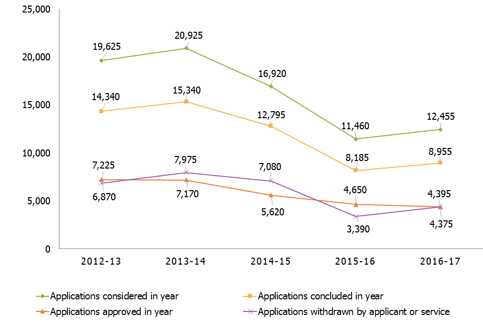 There was an increase of 9% in applications considered during 2016 to 2017 compared with last year, from 11,460 to 12,455, with a similar proportion completed. However, the conversion rate of completed applications to approvals decreased from 57% to 49%.