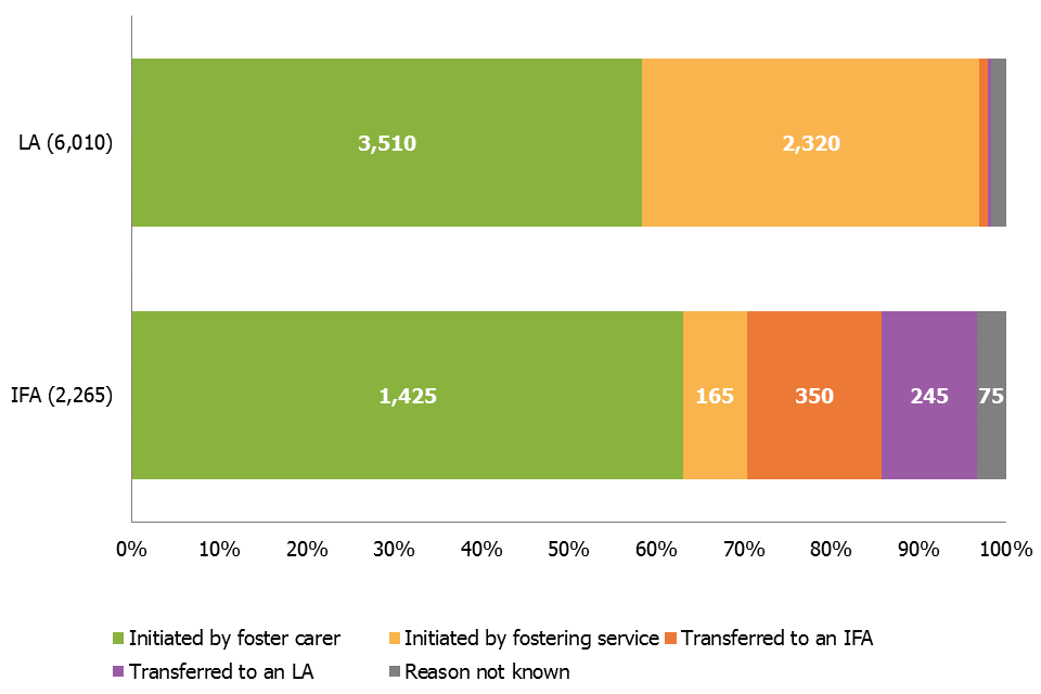 The majority of de-registrations (4,935, or 60%) were initiated by the foster carer, with 2,485 (30%) initiated by the fostering service. The remaining 10% of de-registrations were due to either the household transferring to an IFA (410) or to an LA (270), or for an unknown reason (180).