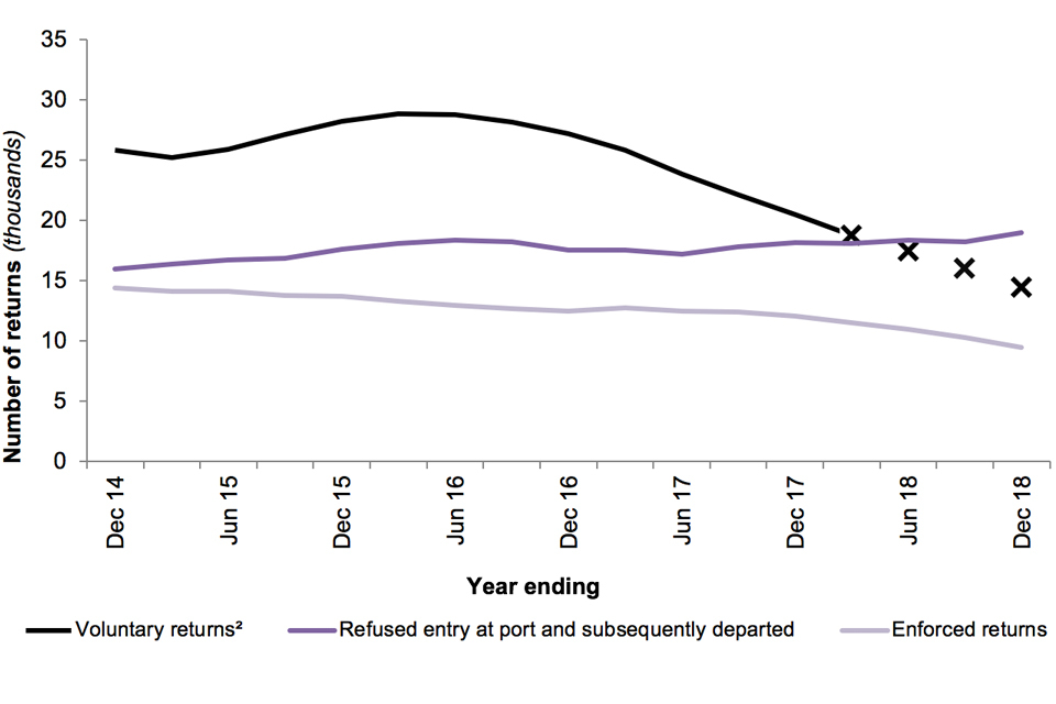 - ‘Voluntary returns’ include a variety of departures, including assisted voluntary returns, controlled returns and other verified returns (for example, through data matching). Comparisons with the previous 12 months for voluntary returns have not been included as data are not comparable over time.