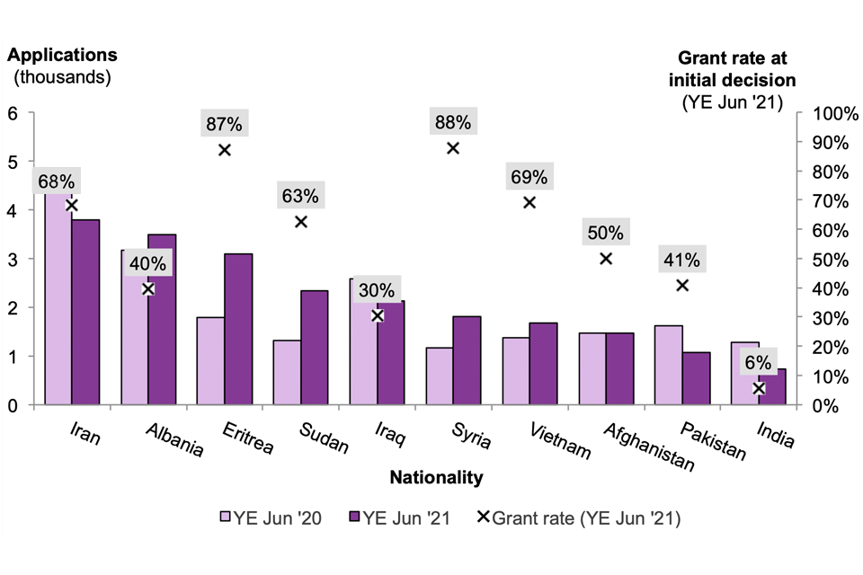 The percentages in the chart are the grant rate at initial decision for each nationality in the most recent year. Grant rate is the proportion of initial decisions which resulted in a grant of protection or other leave. Grant rate is based on year of initial decision and is not directly comparable to applications, which are based on the date the asylum application was made.