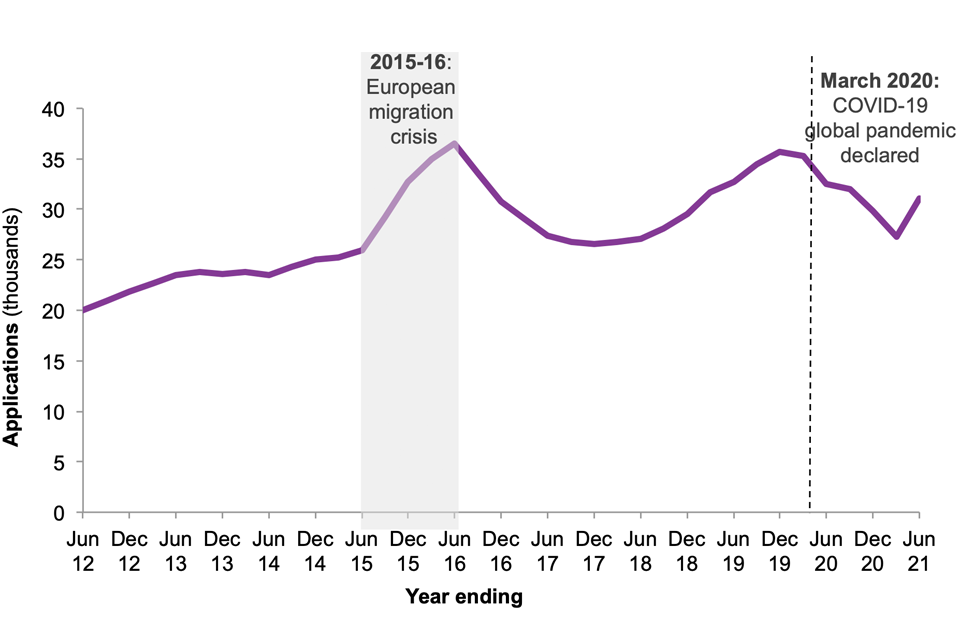 Figure 2: Asylum applications lodged in the UK, years ending June 2012 to June 2021 1