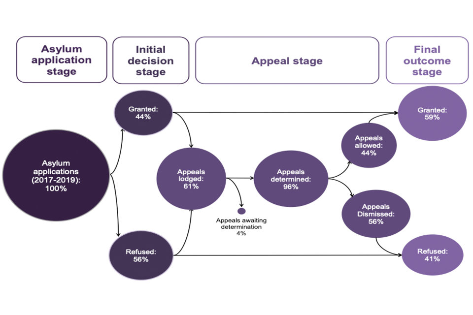 Figure 5 shows that, of those applications received between 2017 and 2019, 44% were granted at initial decision. Of those who were refused asylum at initial decision, 61% lodged an appeal against the decision. Of the appeals lodged, 44% of appeals were allowed and 56% were dismissed. As a result, the grant rate for all applications for asylum made between 2017 and 2019 increased from 44% at initial decision to 59% following appeal.