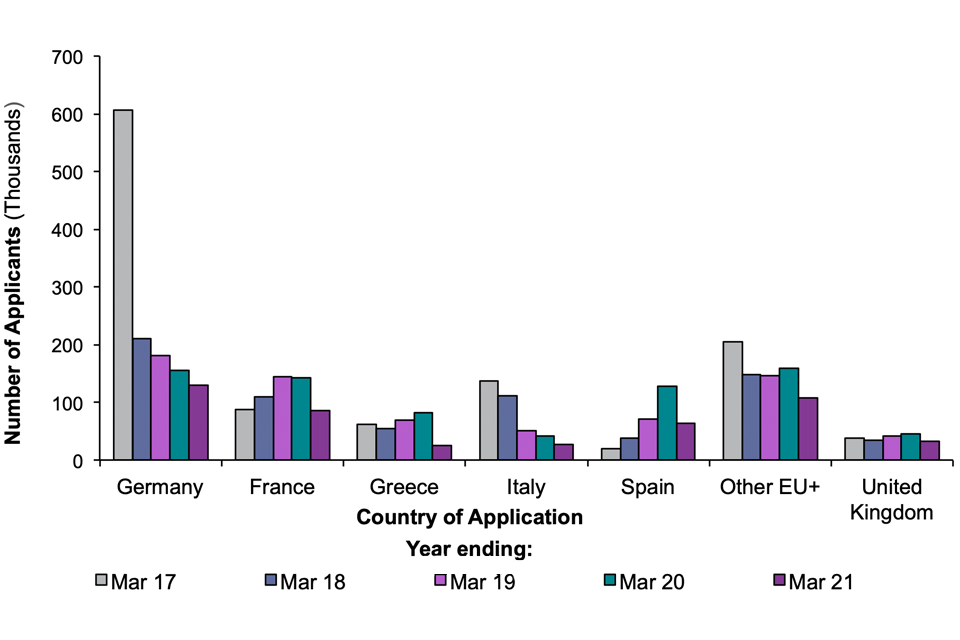 Figure 4 shows between the year ending March 2017 and March 2020, applications to Germany and Italy have dropped, while France, Spain and Greece saw increases. The number of applications to the UK has remained fairly stable in comparison to these top 5 receiving countries. There was a drop in applications for all countries in year ending March 2021, when compared to the previous year, in part due to COVID-19.