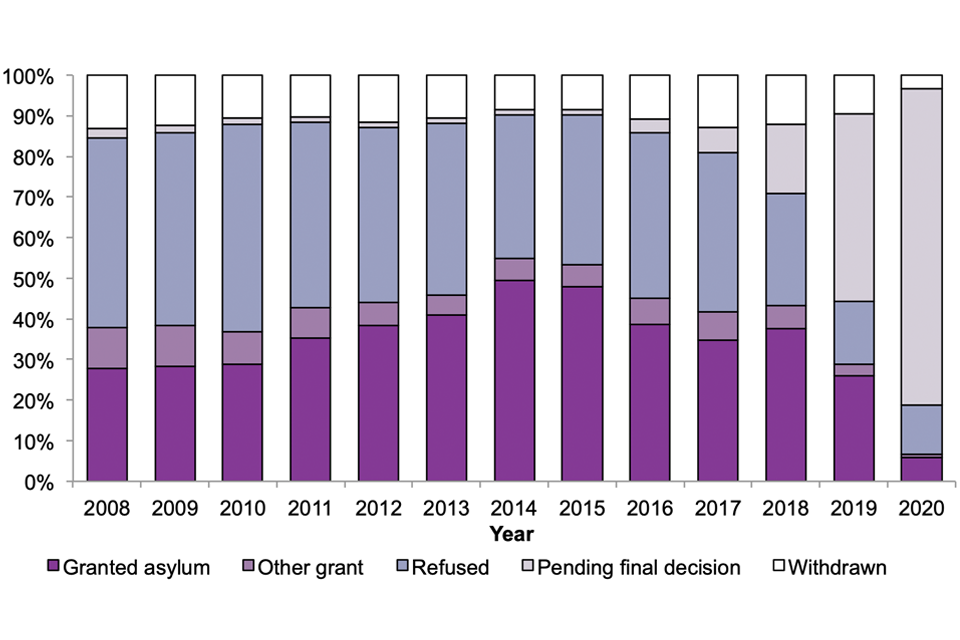 Of those who applied for asylum in the UK in 2020, 23,188 cases (78%) were currently awaiting an outcome. For this reason, the analysis below focuses on the outcomes for applications made before 2020. As more initial decisions are made, and more appeals completed, the number of grants and refusals for applications from all years (but particularly more recent years) will increase, and this will be reported in future statistics.