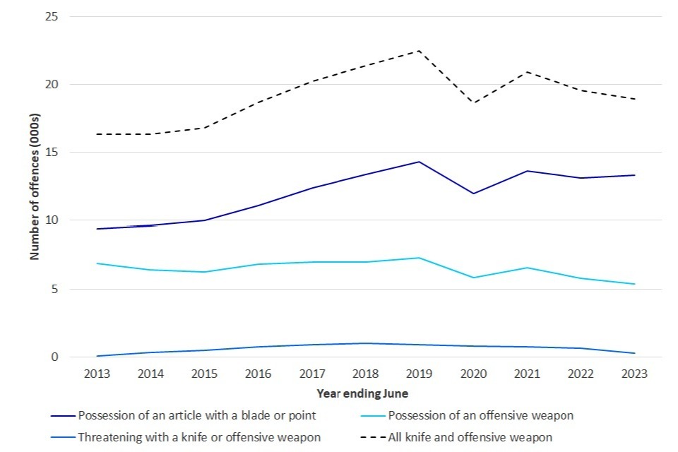 The recent police recorded crime figures published by the ONS showed a 16% increase in the number of knife and offensive weapon offences recorded from 43,003 in YE June 2022 to 49,830 in YE June 2023. Information published by the Home Office on “Crime outcomes in England and Wales” showed that 40% of these offences resulted in a charge or police caution in the year ending March 2023. This is down from 43% in year ending March 2022.