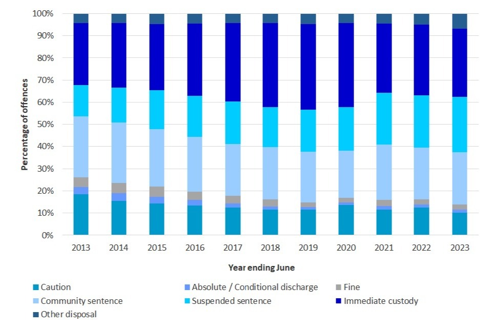 The chart also shows that between YE June 2020 and YE June 2023 there was a corresponding increase in the proportion of offenders receiving a suspended sentence (20% to 25%), making it the second most common disposal in YE June 2023. Please note, however, that the picture for this latest year could potentially change as cases referred to the Crown Court for sentencing receive final decisions.