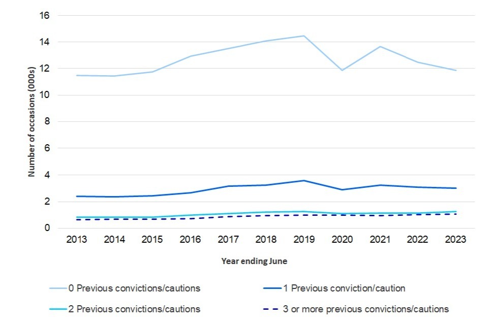 A similar pattern can be seen in the number of offenders who have at least one previous knife or offensive weapon offence. Both rose between YE June 2013 to YE June 2019, followed by a fall in YE June 2020 when the work of the courts was affected by restrictions imposed during the pandemic and a rise the following year as courts reopened. However, over the next two years the number of offenders who have at least one previous knife or offensive weapon offence fluctuated slightly, ending on 5,353 in YE June 2023.