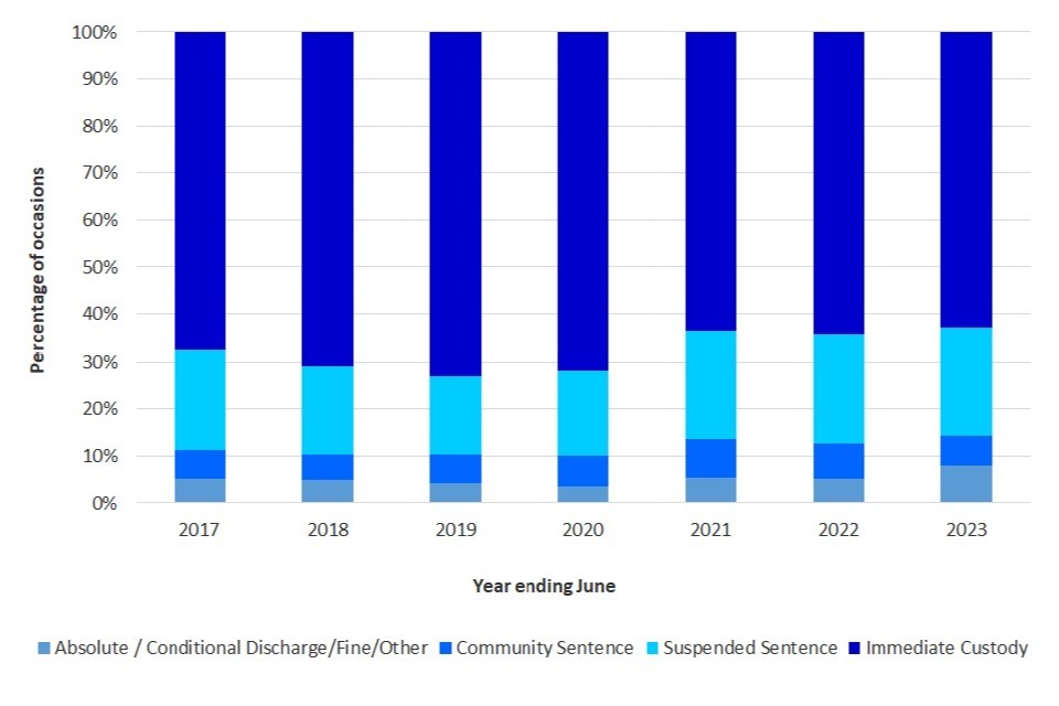 The proportion of offenders receiving immediate custody in YE June 2023 was 31%, one percentage point lower than in YE June 2022. Between YE June 2018 and YE June 2020 it had been 38%-39%, but this fell to 31% in YE June 2021 and remained broadly stable over the following two years. A corresponding increase is evident in the proportion of offenders receiving a suspended sentence (25% in YE June 2023, up from 20% in YE June 2020). There have likely been factors that emerged during and since the pandemic that have influenced sentencing decisions.”