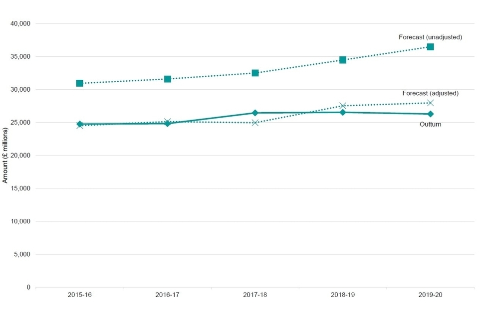 Figure 2: Total capital expenditure in real terms: unadjusted forecast, adjusted forecast, and final outturn, England, 2015-16 to 2019-20