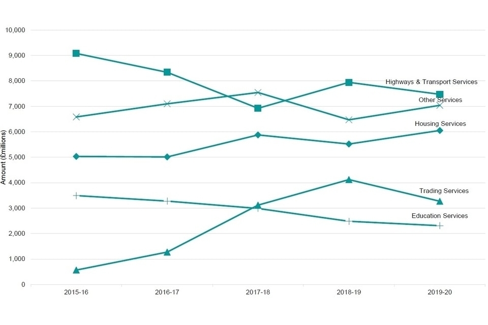 - Expenditure on trading services totalled £3.3 billion in 2019-20, down £852 million (21%) in real terms from the previous year. This follows a large increase from £566 million in 2015-16 to £4.1 billion in 2018-19 (in 2019-20 prices).