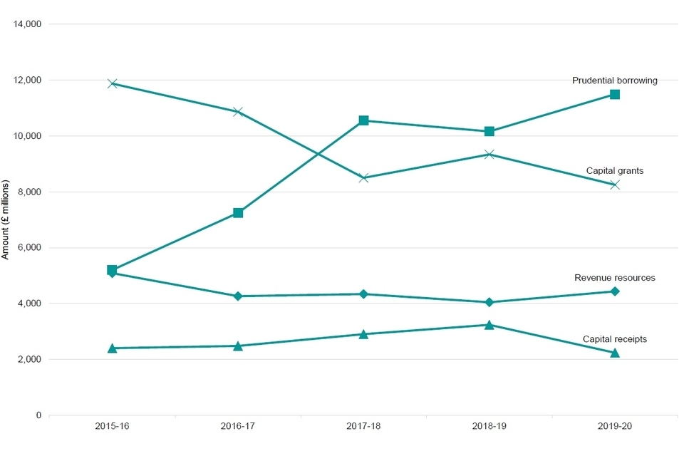 - Prudential borrowing continued to be the largest source of financing at £11.5 billion, and was up £1.3 billion (13%) in real terms from 2018-19. The amount of expenditure financed from this source has doubled since 2015-16.