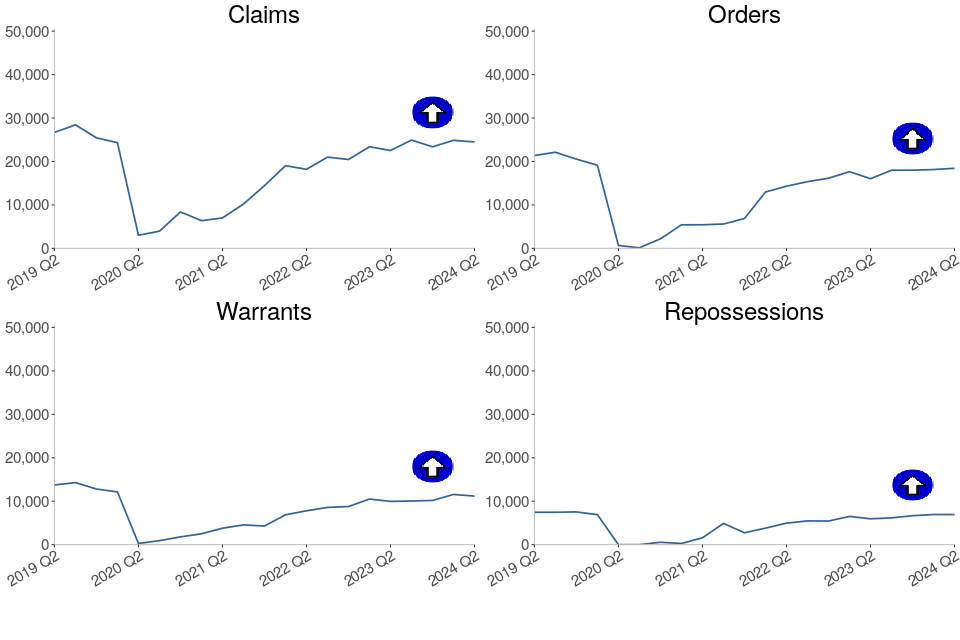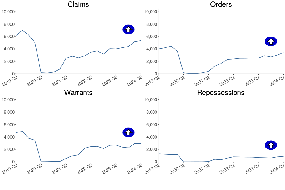 Claims (24,495), orders for possession (18,436), warrants (11,172) and repossessions (6,927) have increased by 9%, 15%, 12% and 16% respectively compared to the same quarter in 2023.