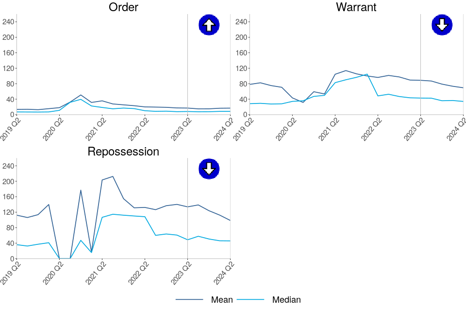 The median time taken to complete landlord actions increased for orders, warrants and repossessions this quarter.