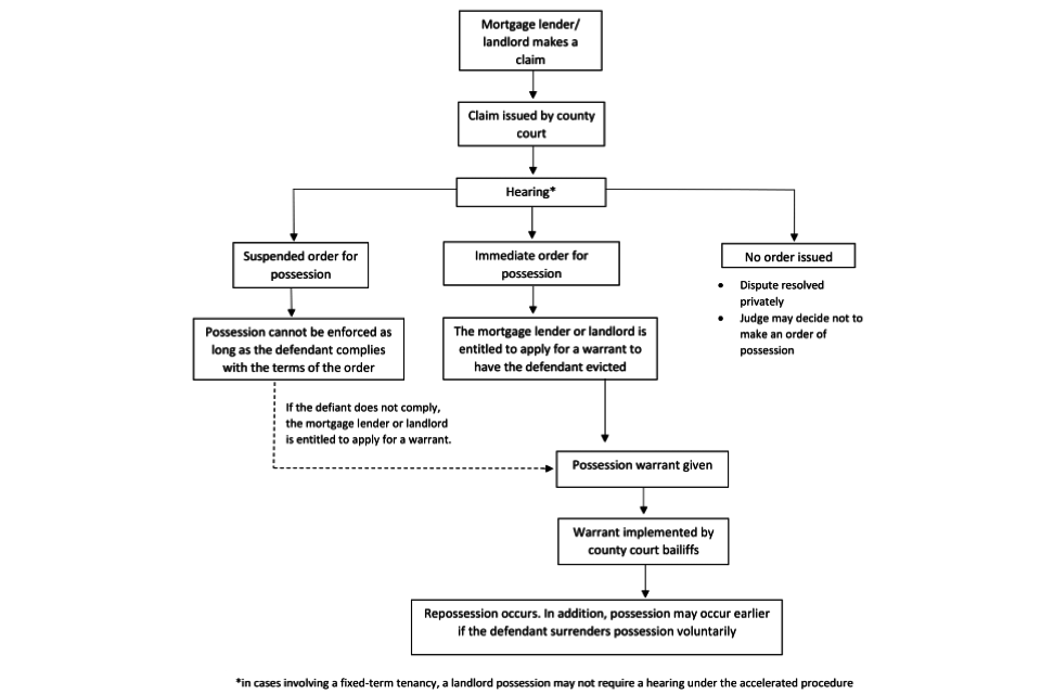 To obtain a court order granting the entitlement to take possession of a property, a claimant – a mortgage lender or a landlord – must first make a claim for possession of property which is then issued by a county court. Generally, the issuing process involves the arrangement of an initial hearing before a judge. At such a hearing, a judge may: