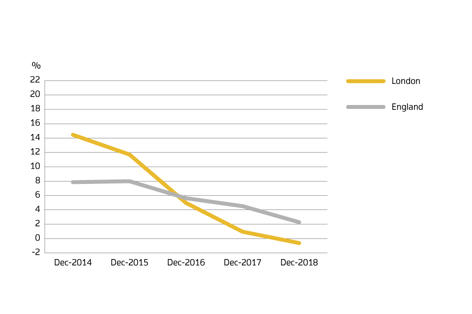 In London, average house prices decreased by 0.6% in the year to December 2018, unchanged from November 2018.