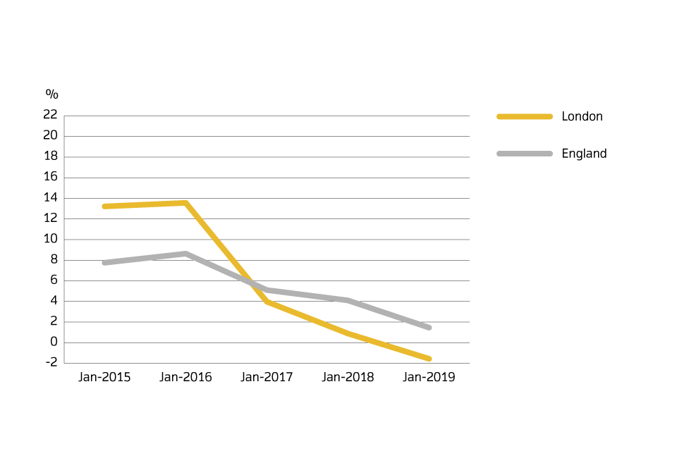 In London, average house prices decreased by 1.6% in the year to January 2019, down from a decrease of 0.7% in December 2018.