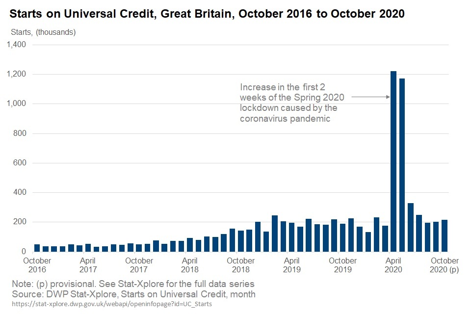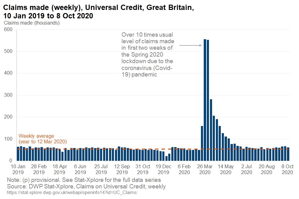 The government made a number of changes to Universal Credit to support people through the coronavirus (COVID-19) pandemic in March 2020. These changes, together with the changes in people’s circumstances caused by the coronavirus pandemic, resulted in a large increase to the number of starts to Universal Credit between 13 March 2020 and 14 May 2020. In total between these dates there were 2.4 million starts to Universal Credit. This contributes to a total of 3.6 million claims for Universal Credit having started between 13 March 2020 and 8 October 2020.