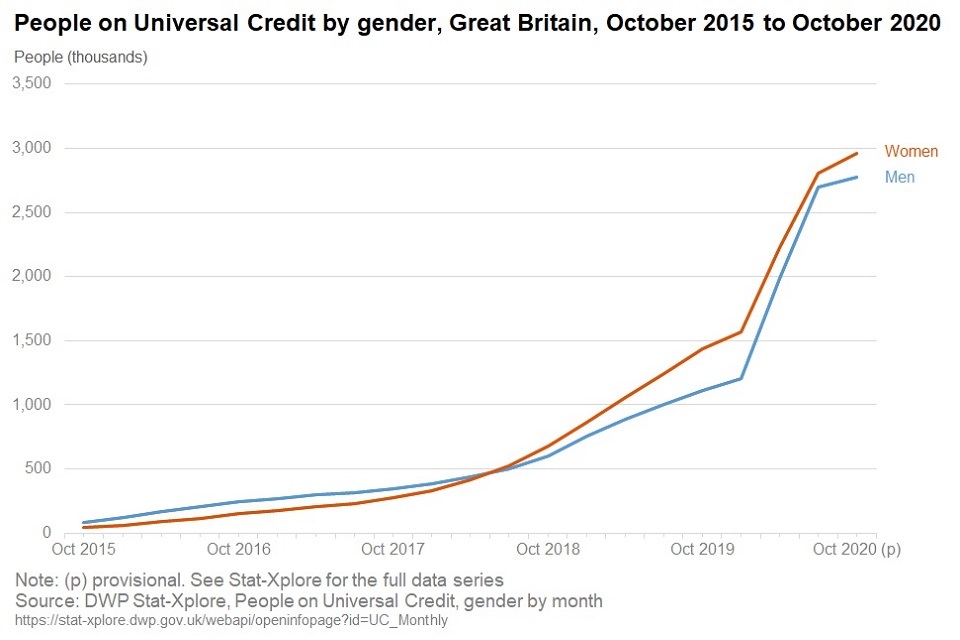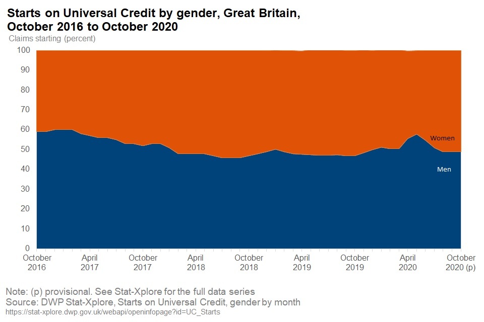 The number of starts to Universal Credit have returned to levels that are comparable to before the coronavirus pandemic and over half of starts to Universal Credit are women. In the 4 weeks to 8 October 2020, 51% of starts were women.