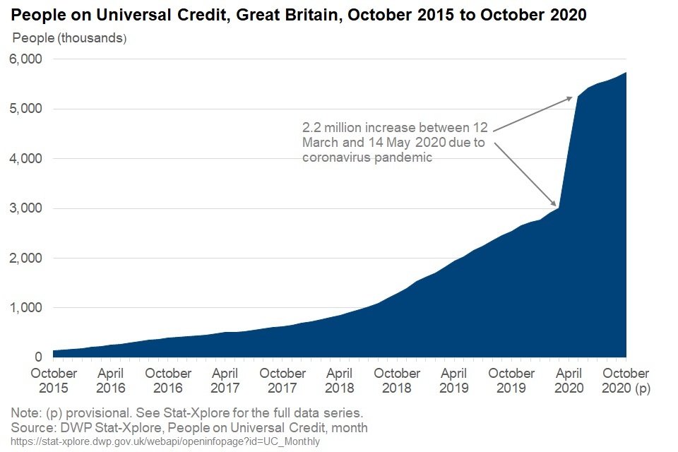 The number of people on Universal Credit was 5.7 million on 8 October 2020, up 2% on 10 September 2020. There has been a 90% (2.7 million) increase in the number of people on Universal Credit from 3 million on 12 March 2020, the last count date before the coronavirus pandemic.