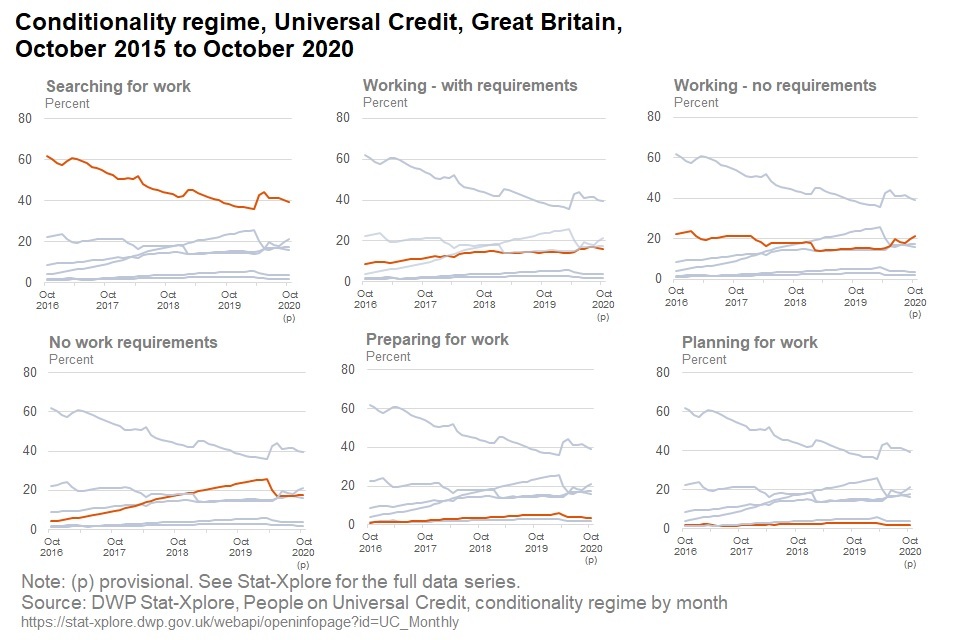 All people on Universal Credit are placed into one of four conditionality groups, depending on their personal circumstances. Which of these groups they are placed into will determine what activities they are required to do (if any) as part of their claim. Universal Credit statistics uses the term conditionality regime in place of ‘conditionality group’ and ‘labour market regime’. The table below shows the circumstances of individuals for each conditionality regime and the associated group and labour market regime.
