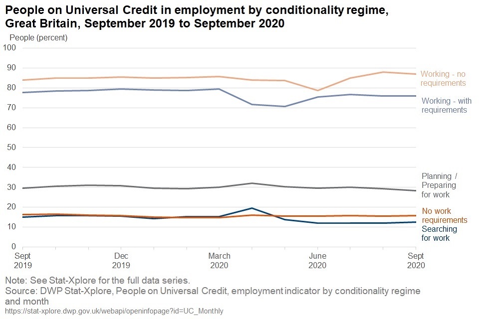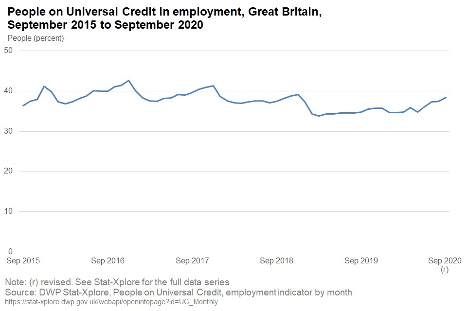 The proportion of Universal Credit who are young people has increased to its highest level since November 2017. In the 4 weeks to 8 October 2020, the proportion of Universal Credit claimants who were aged between 16 and 24 was 27.1%, compared with 21.1% in the 4 weeks to 12 March 2020.