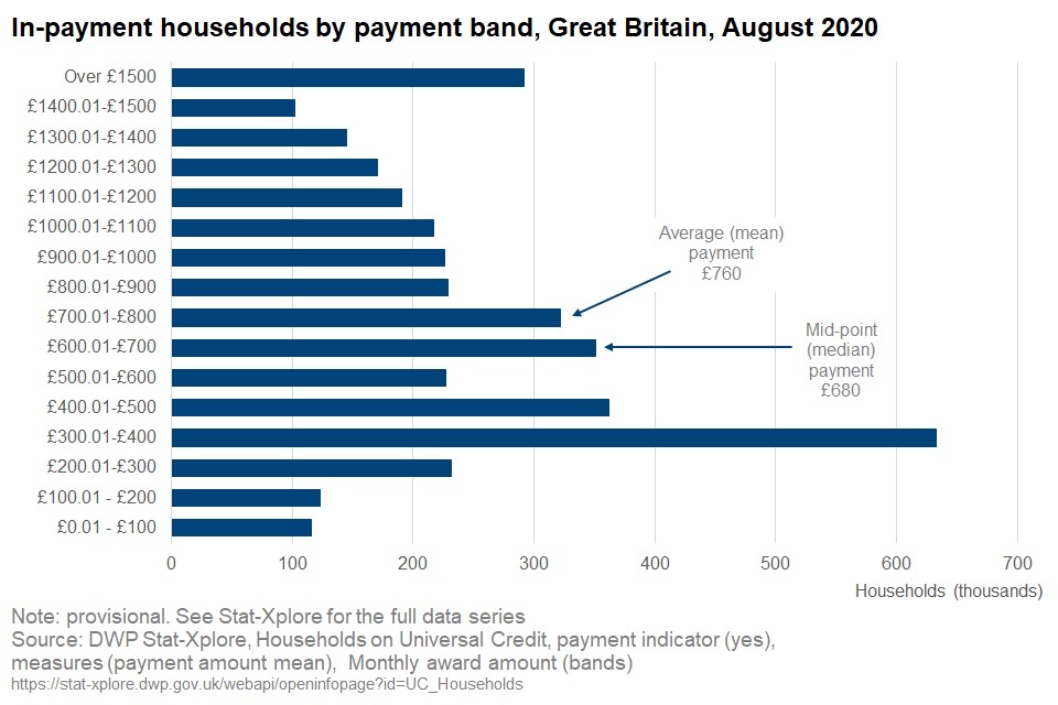 In August 2020, the median payment – the amount where 50% of households are paid more, and 50% of households are paid less than – is lower than the average (mean) payment at £680.
