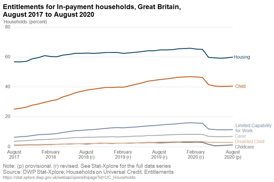 Entitlement for housing is included in the majority of awards to households in payment, with 60% of payment awards including this element in August 2020, down from a peak of 66% in January 2020.