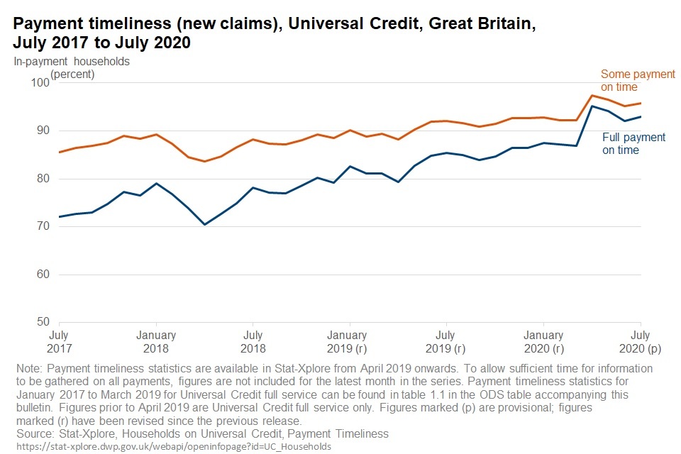Payment timeliness for all claims in payment has continued an upward trend during the coronavirus pandemic. Of households with a non-£0 award, 98% received all their payment on time in July 2020. This is an increase from 95% in March 2020, and 92% in July 2019.