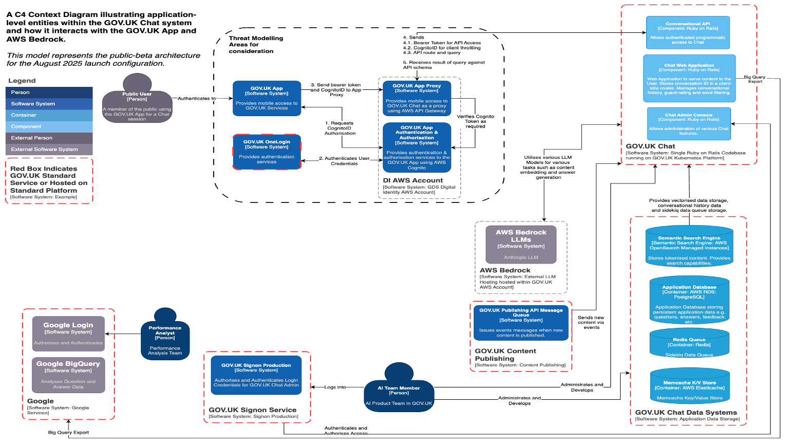 The key aspects of the system are: 1. The content ‘vectorstore’ database. This is a database of a subset of the GOV.UK content corpus. The content is firstly filtered for document types likely to contain personal data which are then removed. Then, any content deemed acceptable is ‘vectorised’ or transformed into a special numerical format which enables rapid semantic searches to be performed on it. We use a managed instance of AWS OpenSearch for this. 1. The logic system is running on GOV.UK infrastructure hosted by AWS. This logic system performs all the necessary steps to orchestrate the question and answer sessions for users. The GOV.UK Chat team use the GOV.UK standards for coding by using Ruby on Rails for the logic running on the standard GOV.UK kubernetes hosting platform. 1. Our Large Language Model is provided by Anthropic and is hosted within a GOV.UK AWS Account using the AWS Bedrock environment. This provides a private instance of the LLM restricting access to any data provided to people with access to that AWS account. GOV.UK Chat are specifically using Anthropic Claude models all hosted within AWS Bedrock. 1. The GOV.UK App is the only mechanism available to the general public to access GOV.UK Chat. The App is produced by a team within the Products and Services Directorate and is available on both major platforms (iOS and Android). 1. The GOV.UK Chat Admin system is an application only available to the GOV.UK AI Team members to administer and manage the Chat application. This is used to view overall system performance as well as answer quality and to highlight any malicious usage by users. Access to this system is managed by the GOV.UK Signon service and all access is logged for audit purposes. 1. GOV.UK Chat team uses the Google BigQuery system to perform more detailed analysis of the question and answer data to ensure we are providing high-quality responses as well as other analyses.