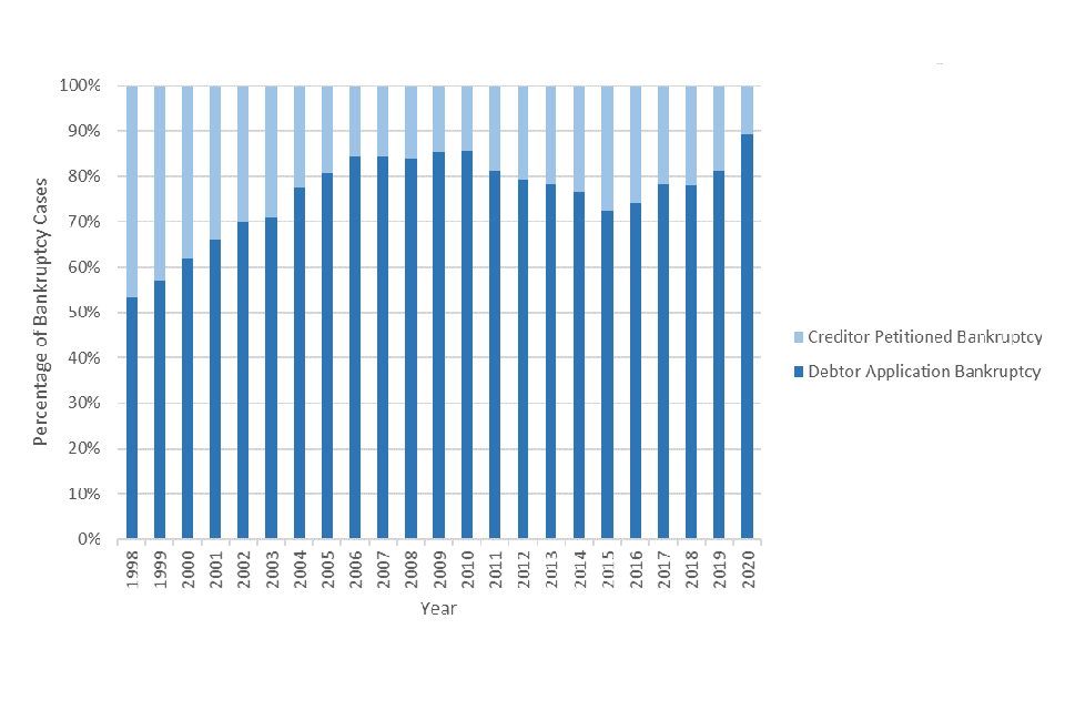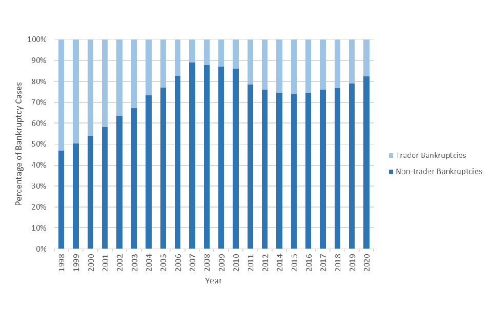 Data shows that in 2021, 16% of bankruptcies in England and Wales were traders (debtors who were either self-employed or ran an unincorporated business at the time of the order). This was a reduction from 18% of bankruptcies in 2020 (see Figure 2 at Chapter 5.3 below).