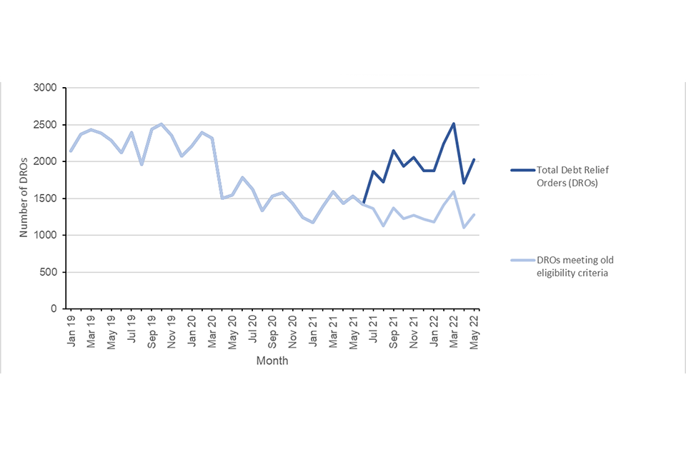 There were 20,135 DROs recorded in 2021 in England and Wales, which was lower than in 2020 (20,473). However, in the 11 months since the change in DRO eligibility criteria, an estimated 7,787 individuals have had a DRO approved who would not previously have been eligible. This means that (assuming no changes to application behaviour) the number of DROs is estimated to be approximately 55% higher than it would have been without the change to criteria. For the 5 years before the pandemic in March 2020, DROs had averaged just over 26,000 per annum.