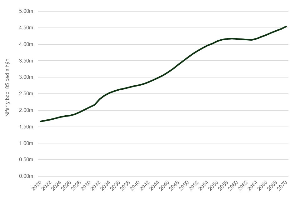 - Disgwylir i nifer y bobl 85 oed a hŷn bron ddyblu dros y 25 mlynedd nesaf, gan godi o 1.7 miliwn o bobl yn 2022 i 3.3 miliwn erbyn 2047.